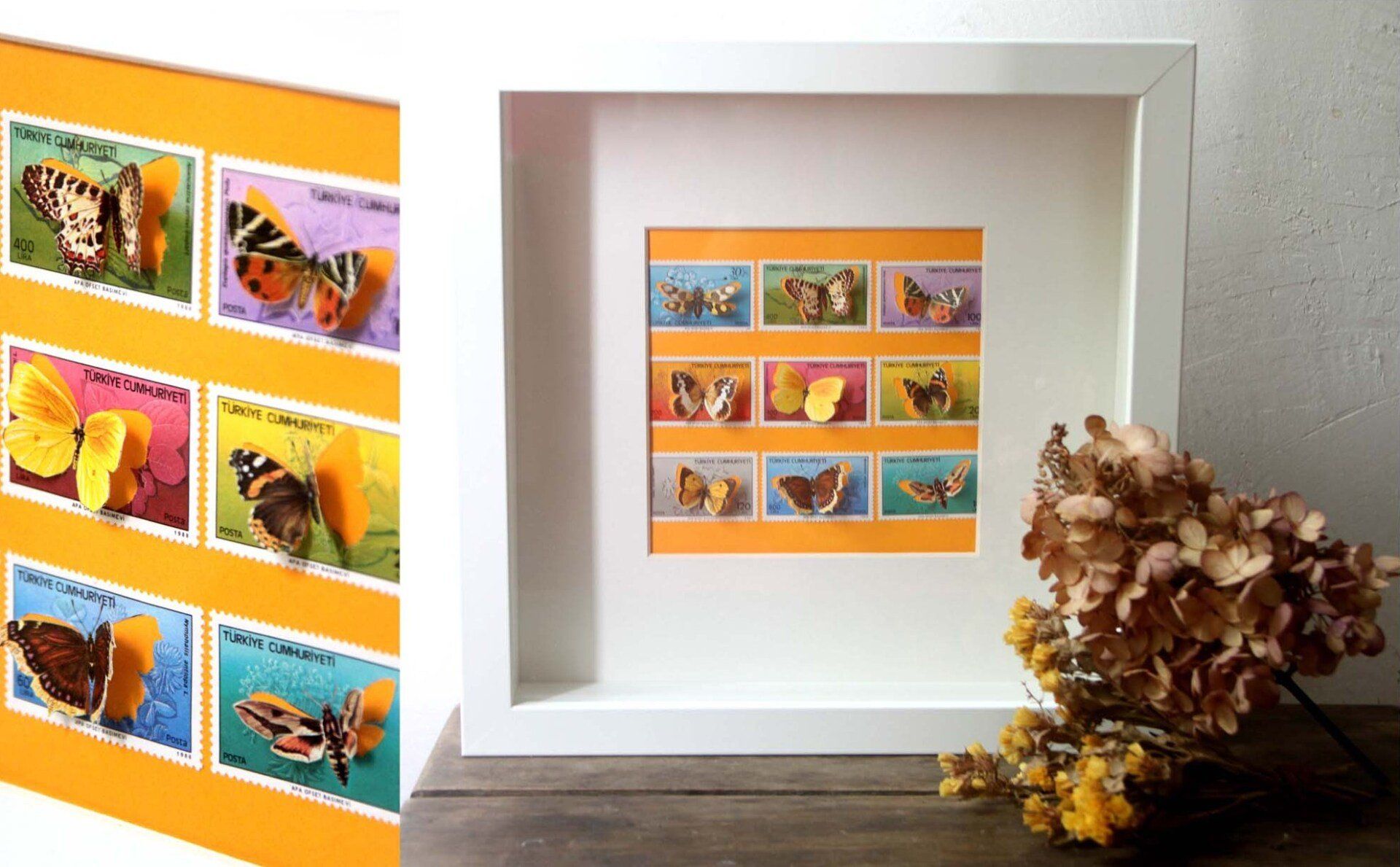 in French) are a collection of unique pieces made from upcycled hand-cut postage stamps and vintage boxes. They are inspired by the insect collections of my grandfather, who was an entomologist and a botanist, and by the botanical world.