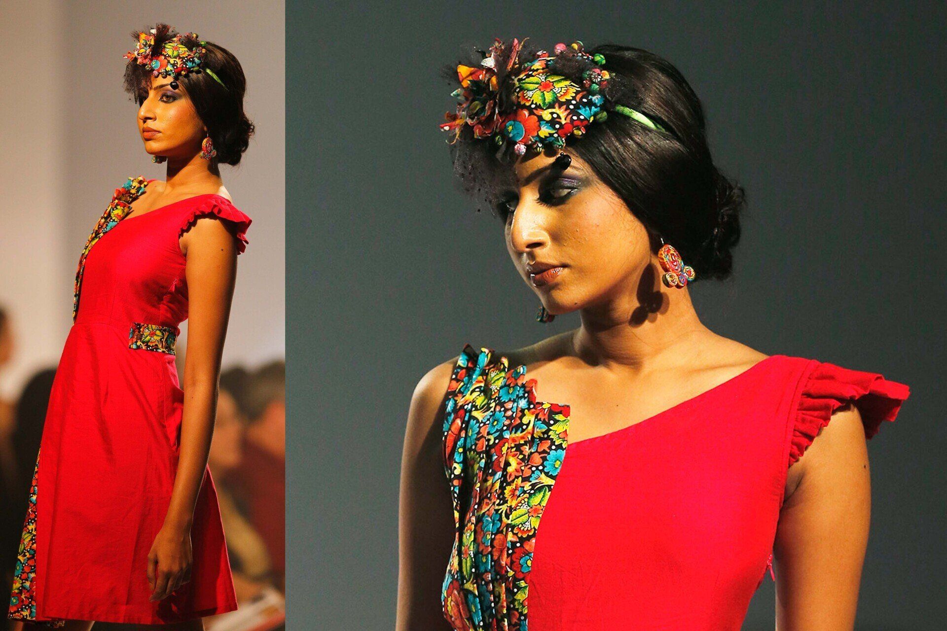 Création et réalisation d'accessoires textiles pour la collection "Kurunegala Rive-Gauche" de DENETH/Flower Power Sri Lanka, fabriquée à partir de "cheetha" -coton fleuri traditionnel du Sri Lanka- et de coton tissé main à Kurunegala, présentée à la Colombo Fashion Week 2013, Sri Lanka.