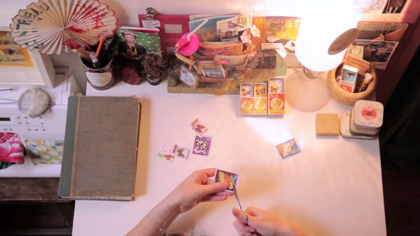 est une collection de pièces uniques créées à partir de timbres upcyclés découpés à la main et de boîtes anciennes.