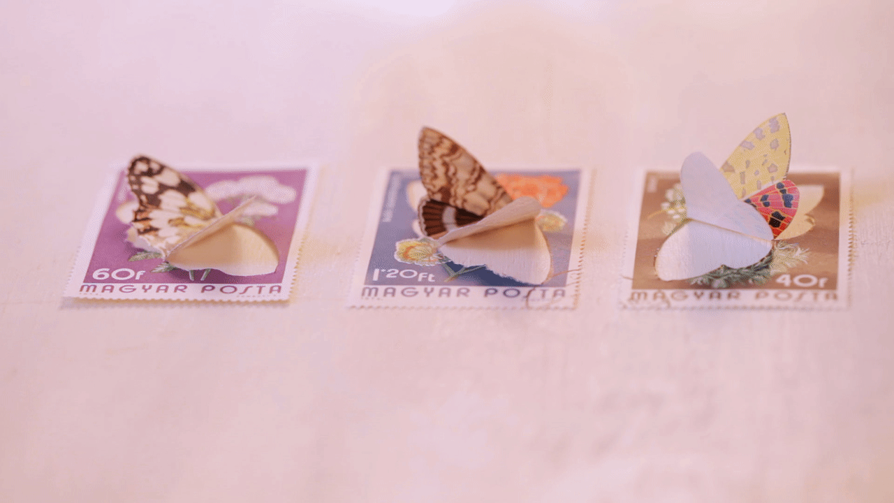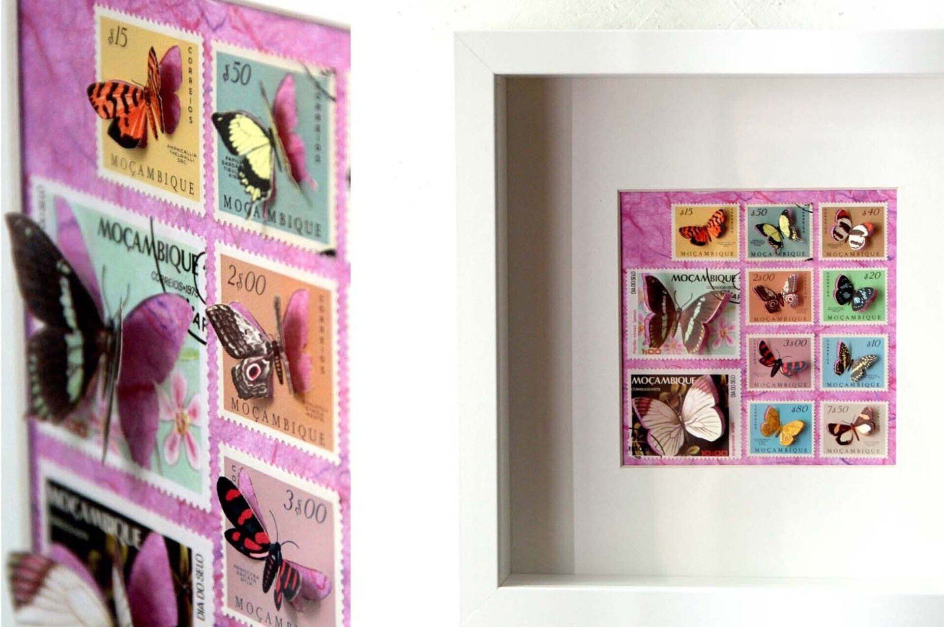 est une collection de pièces uniques créées à partir de timbres upcyclés découpés à la main et de boîtes anciennes.